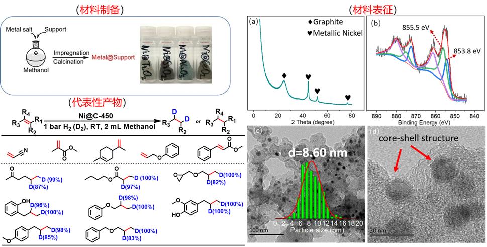 图1.首次多相纳米催化用于室温/常压下生物质基化学品C=C的选择性还原和氢同位素标记。