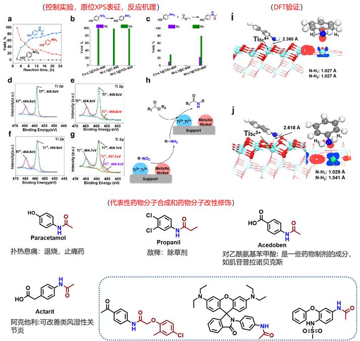 许多药物具有酰胺结构,如对乙酰氨基酚、青霉素等。酯/羧酸和胺的酰胺化反应是合成酰胺的方法之一。现有的合成方法以均相催化体系为主,使用有毒的有机配体,三甲基氯硅烷(TMSCl,为无色透明液体,有刺激臭味),易燃的金属单质粉末等。此外,胺是一种异变质的化学品,使用胺为原料合成酰胺具有不经济性。因此,理想路线是将稳定的硝基化学品和酯经一锅法合成酰胺。但是,此合成路线还没有相关非均相催化方法的报道。针对这一“卡脖子”技术难题,我们开发了二氧化钛负载的镍基催化剂,并成功用于从硝基和酯合成大量酰胺(>60个酰胺产物)。该催化剂不仅表现出非常好的官能团选择性,而且在10克级别的放大实验室上产品的收率也可达到80%以上。