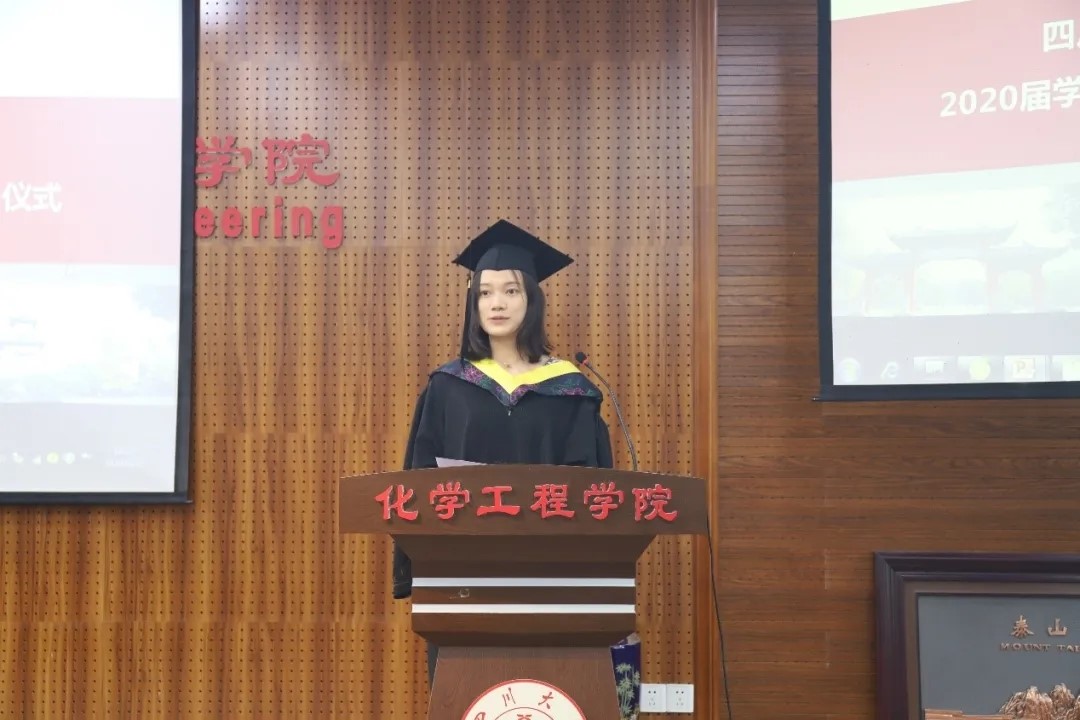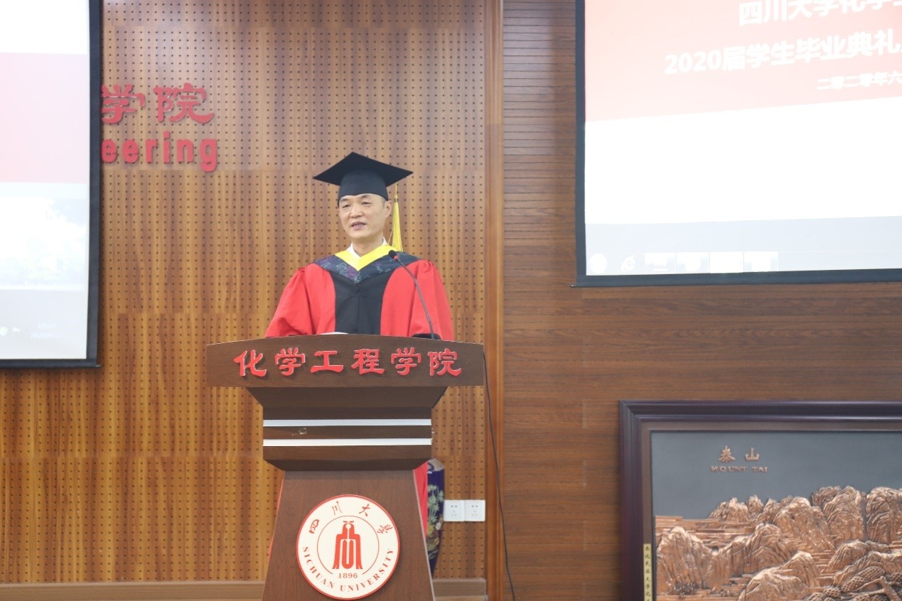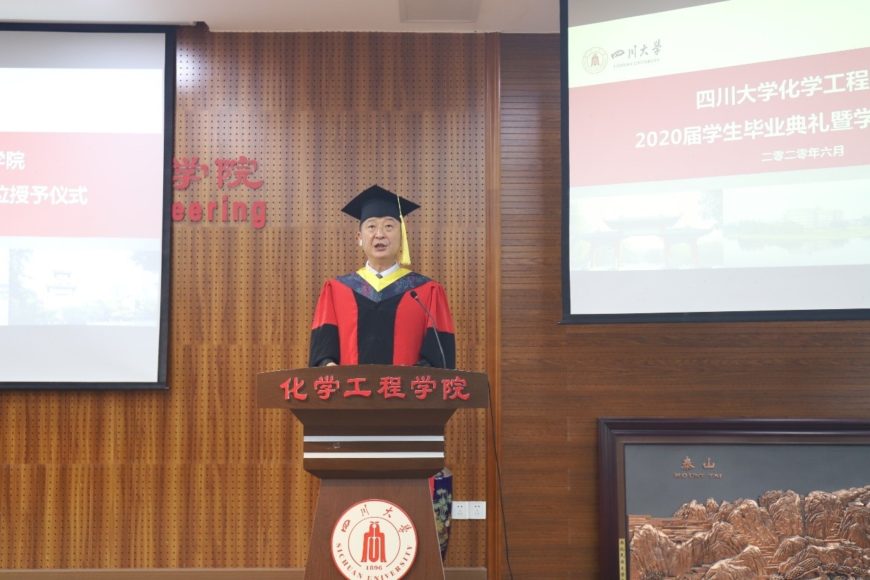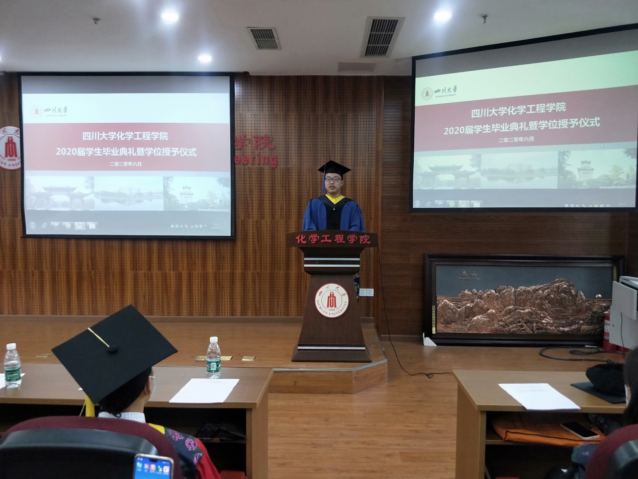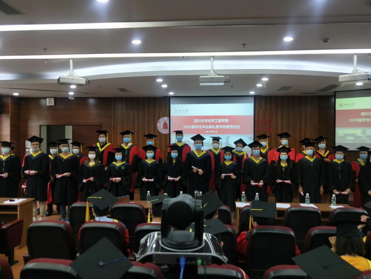 2020届学生毕业典礼暨学位授予仪式在望江校区正行楼313报告厅隆重举行。受疫情影响,本次毕业典礼暨学位授予仪式采用线上、线下同时进行的模式,部分学生代表和全体2020届毕业的18位博士研究生、207位硕士研究生和248位本科生及学生家长们通过网络线上模式齐聚一堂,在师长亲友的共同见证下,为自己的川大化工求学岁月画上圆满的句号,开启新的人生征程。