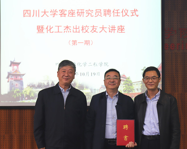 客座研究员聘任仪式暨化工杰出校友大讲堂第一场在望江校区化工楼313报告厅举行。学院1986级无机化工专业杰出校友、西南化工研究设计院有限公司党委书记、总经理陈健受聘为学校客座研究员,并为学院180余名师生带来了题为“吸附分离技术研究和应用进展”的精彩报告。西南化工研究设计院有限公司党委办公室副主任赵明明女士、团委副书记姬存民校友、学院领导班子成员等出席了聘任仪式和报告会。会议由学院院长赵长生教授主持。
