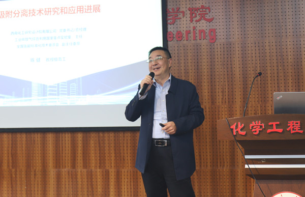 在热烈的掌声中,陈健总经理做了题为“吸附分离技术研究和应用进展”的学术报告。陈健校友回顾了在学校求学的点滴,对学校和学院的培养表示感谢。接着,他从西南化工研究设计院的历史讲起,回顾了西南院近年来取得的标志性成果。随后,结合西南院现阶段的重点研究领域,从PSA技术、专家诊断和自适应控制系统等方面,结合典型装置案例,详细介绍了吸附分离技术。