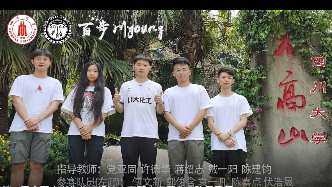 伏浩晟、袁一凡、陈喜点、郭俊含、傅文新5位同学组成的百步川young一路过关斩将,力压群雄,再次荣获西南赛区金奖(第一名),并将与重庆大学“南湖筑梦”、西南石油大学“千里马”、四川轻化工大学“大江大河”、西南民族大学“化工爱爱爱不完”团队携手代表西南赛区参加于8月16-23日由厦门大学承办的全国总决赛,展示西南地区化工学子的风采。