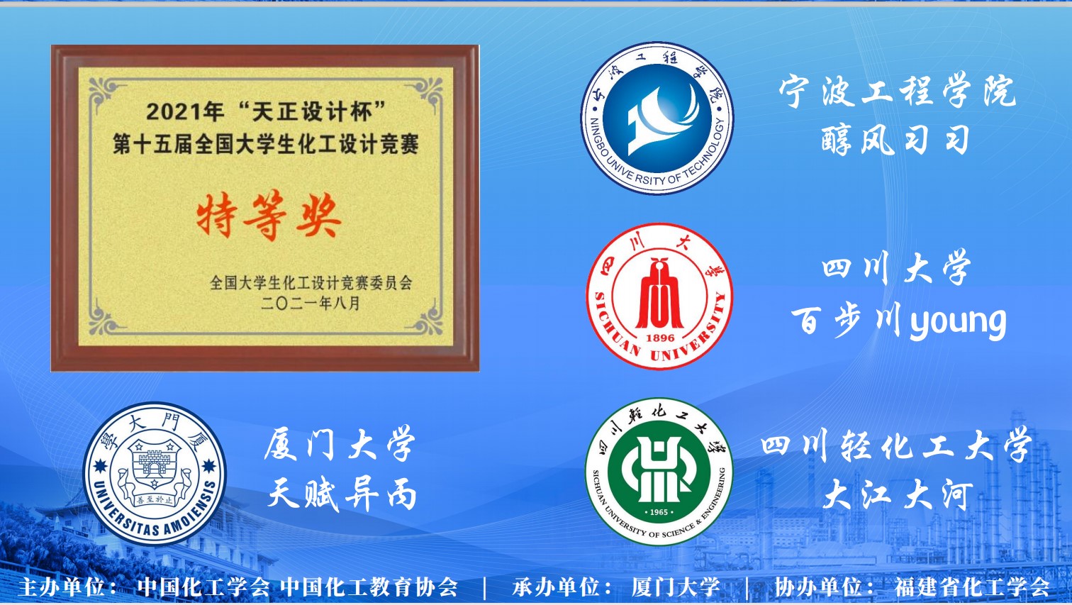 “百步川young”团队一路过关斩将,力压群雄,荣获西南赛区金奖(第一名),并与重庆大学“南湖筑梦”、西南石油大学“千里马”、四川轻化工大学“大江大河”、西南民族大学“化工爱爱爱不完”团队代表西南赛区挺进全国总决赛。