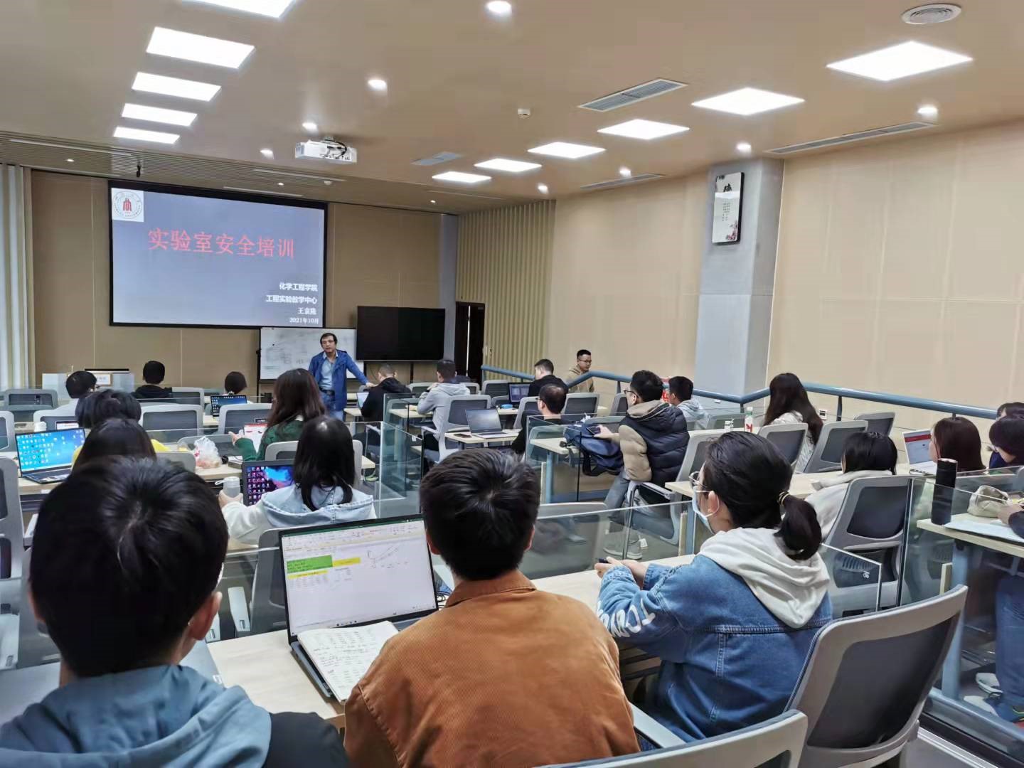 随后,王袁隆老师详细地从安全的定义、实验室安全的重要性、实验室药品的存放、实验室人员的防护、实验室安全事故分析、实验室事故紧急处理方案等角度出发,讲述实验安全的重要性,提高同学们安全意识,增加同学们自我防范能力。其中针对这次南航的爆炸事故,王老师分析了事故原因,实验室中的铝镁合金粉末发生爆燃,随后镁铝粉遇到水和氧化铜,迅速发生进一步发热随后发生爆炸。除此之外还分析其他粉尘爆炸的事故,以及不同事故应该使用的处理方案。