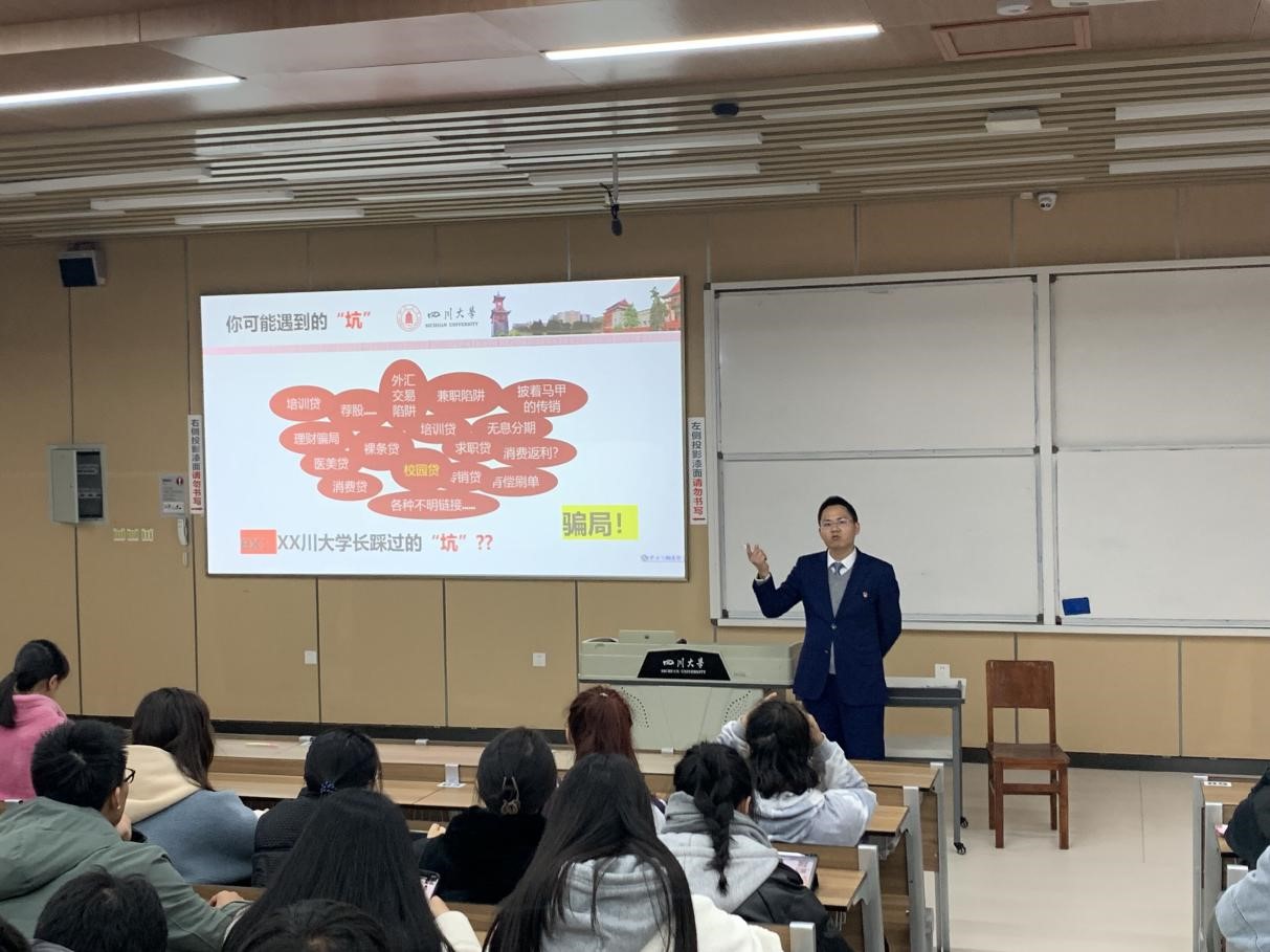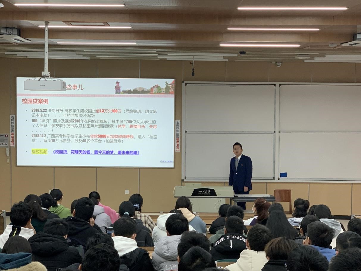宣讲会第一部分,围绕“校园贷”的话题进行。其常常被包装为“零抵押、低利息、无需个人征信”的“小额贷款”,实则为“砍头息、利滚利”的巨额债务深渊。“校园贷,花明天的钱,圆今天的梦,砸未来的路。”王红明行长以实例强调道,即使是川大学子,也同样存在深陷“校园贷”的可能,一旦对其危险程度掉以轻心,将造成不可挽回的恶果,甚至因号呼靡及、无力偿还而酿成惨剧。