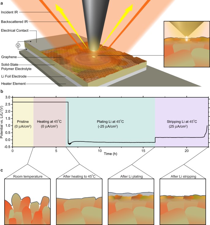 关于这个SEI层已有大量研究报道,这些成果主要是通过非原位的方式对电极/电解质界面的截面展开分析。基于此,学院的何欣特聘研究员在本项目中,创造性的应用单片层石墨烯作为电池集流体,使其在导通电流的基础上也能作为红外表征观测的窗口,配合在惰性气体环境中设计使用的近场红外技术,可以实现纳米尺度的原位微观表征分析。该方案的成功的集合了微观形貌和化学结构的无损表征,明确了初始状态化学组成纳米尺度的异质性是导致锂金属不均匀沉积的基础,并进一步影响界面在电化学过程中形貌和结构的演化,明确指出了未来固体电解质的研究方向。