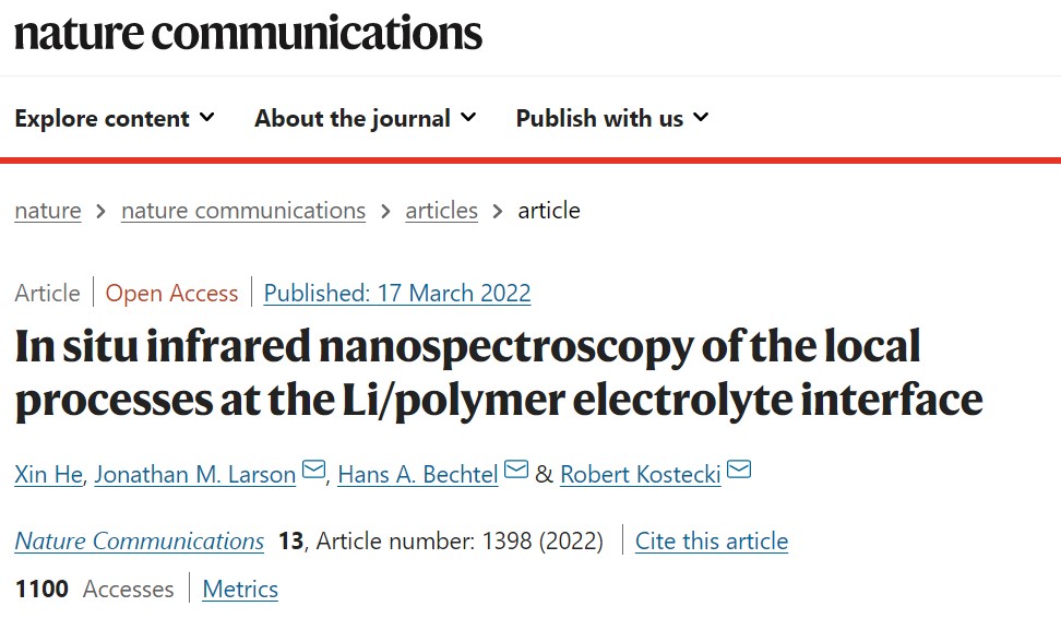 近日,学院何欣特聘研究员在Nature Communications上发表了题为“In situ infrared nanospectroscopy of the local processes at the Li/polymer electrolyte interface”的研究论文。该文章利用近场红外技术对发生在锂电极-聚合物电解质界面的反应进行了原位分析,首次透过石墨烯窗口从纳米尺度定性表征了电化学过程中界面发生的形貌结构和化学组成的演化,提出了基于非均质电解质材料下发生的锂微观结构转变的新型理论模型。
