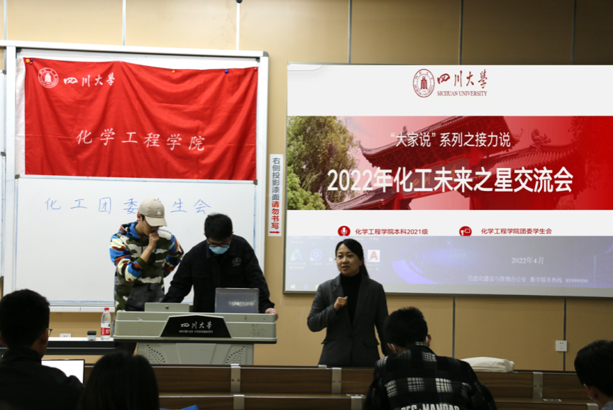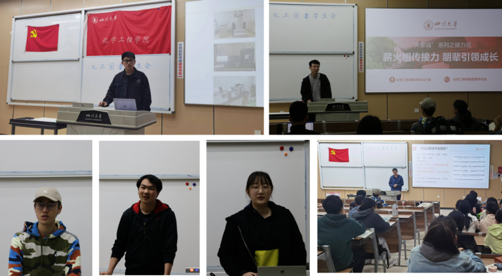 2021级本科年级,一直大力推进学风教育,以优良学风为引领,打造良好教育生态,让学生肩负起“四个服务”的时代使命,强化责任担当,弘扬家国情怀,加深院情了解、学科发展和专业介绍,形成了具有自身特色的学风活动——“大家说”。从新生入学以来,“大家说”在2021级本科中已经成功举办了“老师说”、“朋辈说”和“党员说”系列活动。本期“接力说”,由学院团委主办,邀请了覆盖本硕博不同年级的优秀党员和团员共计6名学生,于2022年4月15日晚上19:00,在江安校区综C507教室,为2021级近50名“化工之星”学生进行交流分享,形成“朋辈引领解疑惑,党团齐心助学风”的良好氛围。