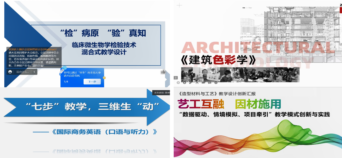 随后由陶传敏老师组黄曦悦老师、黄茜老师、莫群俐老师和张增强老师依次分享了《临床微生物学检验技术》、《建筑色彩学》、《国际商务英语(口语与听力)》和《造型材料与工艺》的课程混合式设计思路及建设经验,由点评专家逐一进行点评,并根据此次“混合式教学设计赛”的评分要点,就说课组织、混合式比赛特点、微课制作及教学活动设计、教研与实践的混合式教学等方面进行了指导,最后自由讨论环节,同参会老师就如何凝练说课内容和混合式教学生态社区的构建进行了探讨。