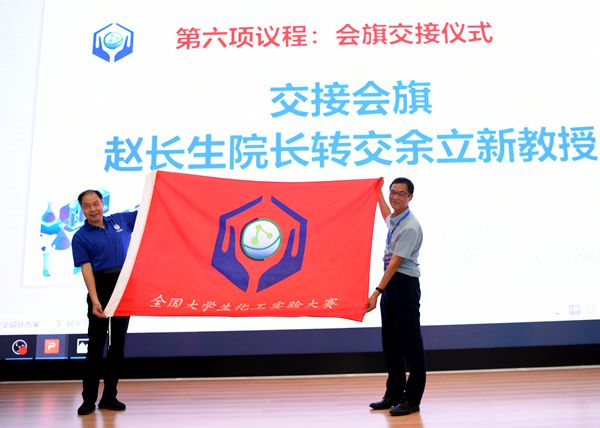最后进行了会旗交接仪式,并由第六届全国大学生化工实验大赛全国总决赛单位、北京化工大学化工学院刘清雅副院长讲话,她表示,感谢中国化工教育协会和大赛组委会的信任和支持,将尽最大的努力办好总决赛,做好服务工作,保证竞赛的公平公正。