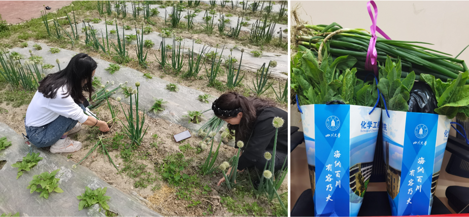 辅导员在开心农场采摘新鲜蔬菜赠送老教师表达感恩之情