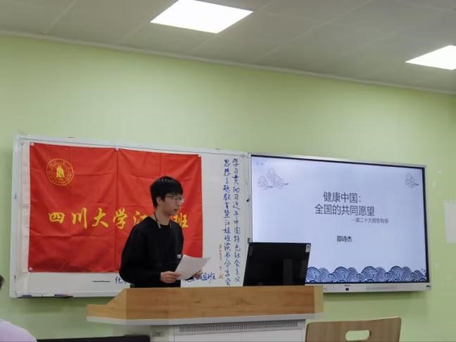 刘书嫚等8位同学分别对党的二十大报告向大家分享读后心得。刘书嫚同学谈到,“读了党的二十大报告,我更加深刻体会到中国共产党艰苦奋斗精神。苦不苦,想想红军二万五;累不累,想想红军游击队。”邵诗杰同学从自身经历出发,说到“我的家乡是河南,在我小时候,医保政策没有完全落地。可如今中心集镇卫生院水平逐步提升,人民群众看病就医更便捷,县域综合医改成效明显。这也应证了习近平总书记所说,江山就是人民,人民就是江山。中国共产党领导人民打江山、守江山,守的是人民的心。”