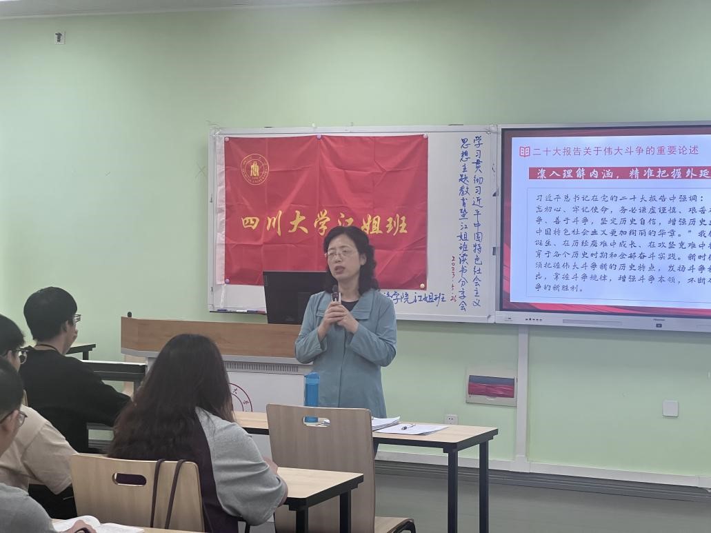 江安校区综合楼B510开展学习贯彻习近平新时代中国特色社会主义思想主题教育暨江姐班读书分享学习会。与会人员有马克思主义学院黄丽珊老师、两学院江姐班学生。