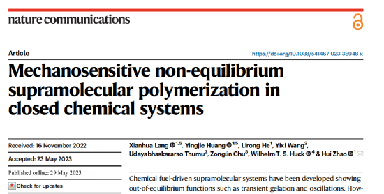 赵辉教授团队在NatureCommunications上发表了题为“Mechanosensitive non-equilibrium supramolecular polymerization in closed chemical systems”的研究论文。该研究主要通过模拟生命体的动态行为构建了密闭体系中的非平衡态的超分子自组装系统。郎咸华博士和黄英杰博士研究生为该论文的共同第一作者,赵辉教授为文章通讯作者,污污漫画