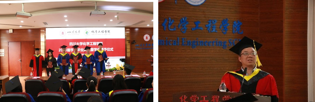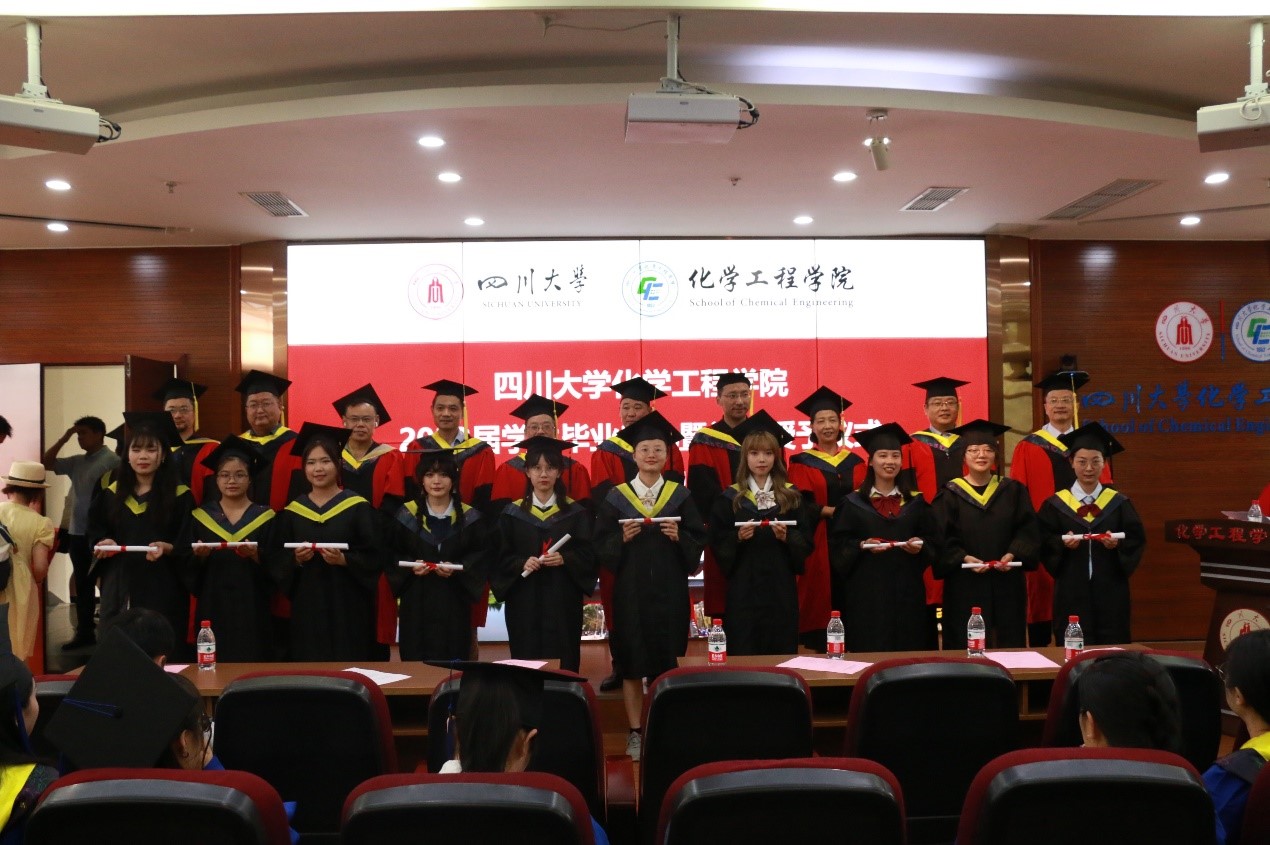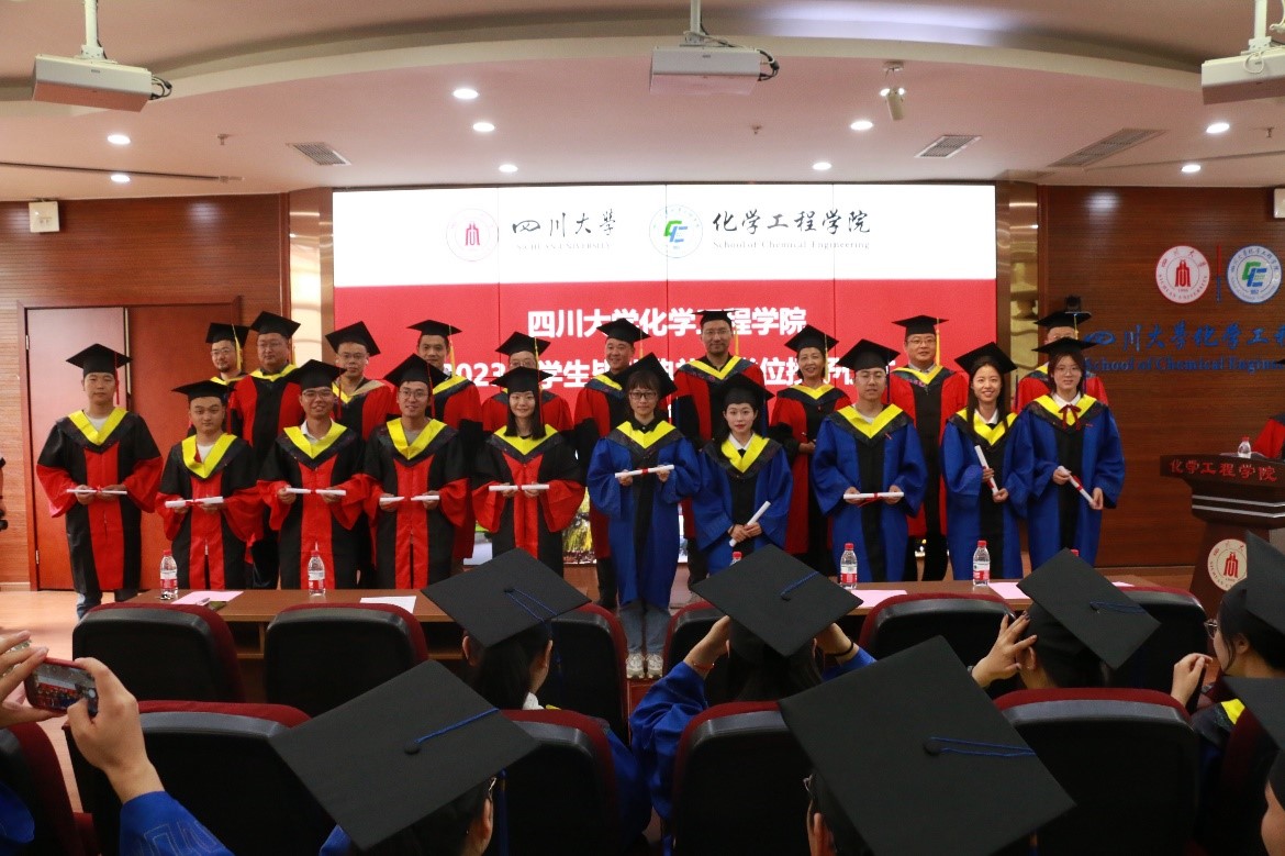 2023届毕业典礼暨学位授予仪式在望江校区化工学院楼313报告厅隆重举行。学院党委书记李天友、院长郭孝东、副书记李德富、副院长唐盛伟、副院长钮大文、工会主席穆畅道、过程装备与安全工程系主任伍勇、国家工科基础课程化学教学基地主任朱权、化学工程系副主任党亚固、制药与生物工程系副主任刘文彬、学生教导员李川娜老师、本科生辅导员老师帕哈尔定,研究生辅导员老师李颖丽,污污漫画