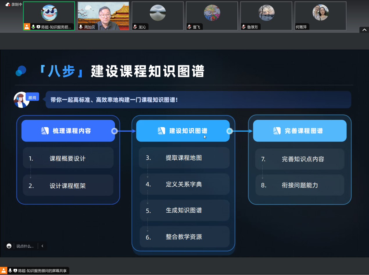 教研室全体成员在教研室主任鲁厚芳教授的带领下参与会议研讨,并对课程知识图谱的产权归属、使用方式、后期维护以及多语种引入等问题进行了深入讨论。陈超老师就这些问题给出了详尽的解答,并向与会者展示了成熟的课程知识图谱案例。