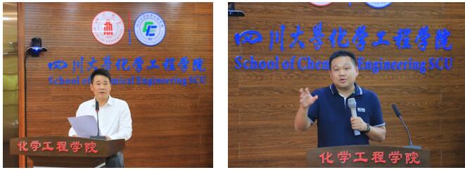 院长郭孝东(左)与杰出校友玉龙化工总工程师叶锐(右)进行新生致辞