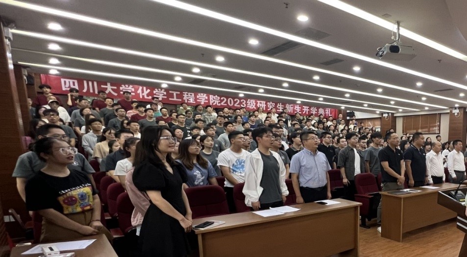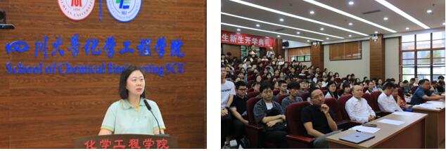 院长郭孝东同志进行新生致辞。郭院长首先对新生同学们表示热烈的欢迎,希望新生同学们能够尽快适应新环境,投入于科研工作中来;尤其提醒同学们要注意学术规范,切忌学术不端,害人害己;更要严格要求自己,做合格的化工人。杰出校友玉龙化工总工程师叶锐致辞,叶锐先生表示,一定要牢记“化工”的实用性,除了关注手头的实验,也要把目光放至长远,如何将手头的技术变为真正可用的、造福人民的实物,抱着这样的胸怀不断前行,前路一定会越来越开阔。