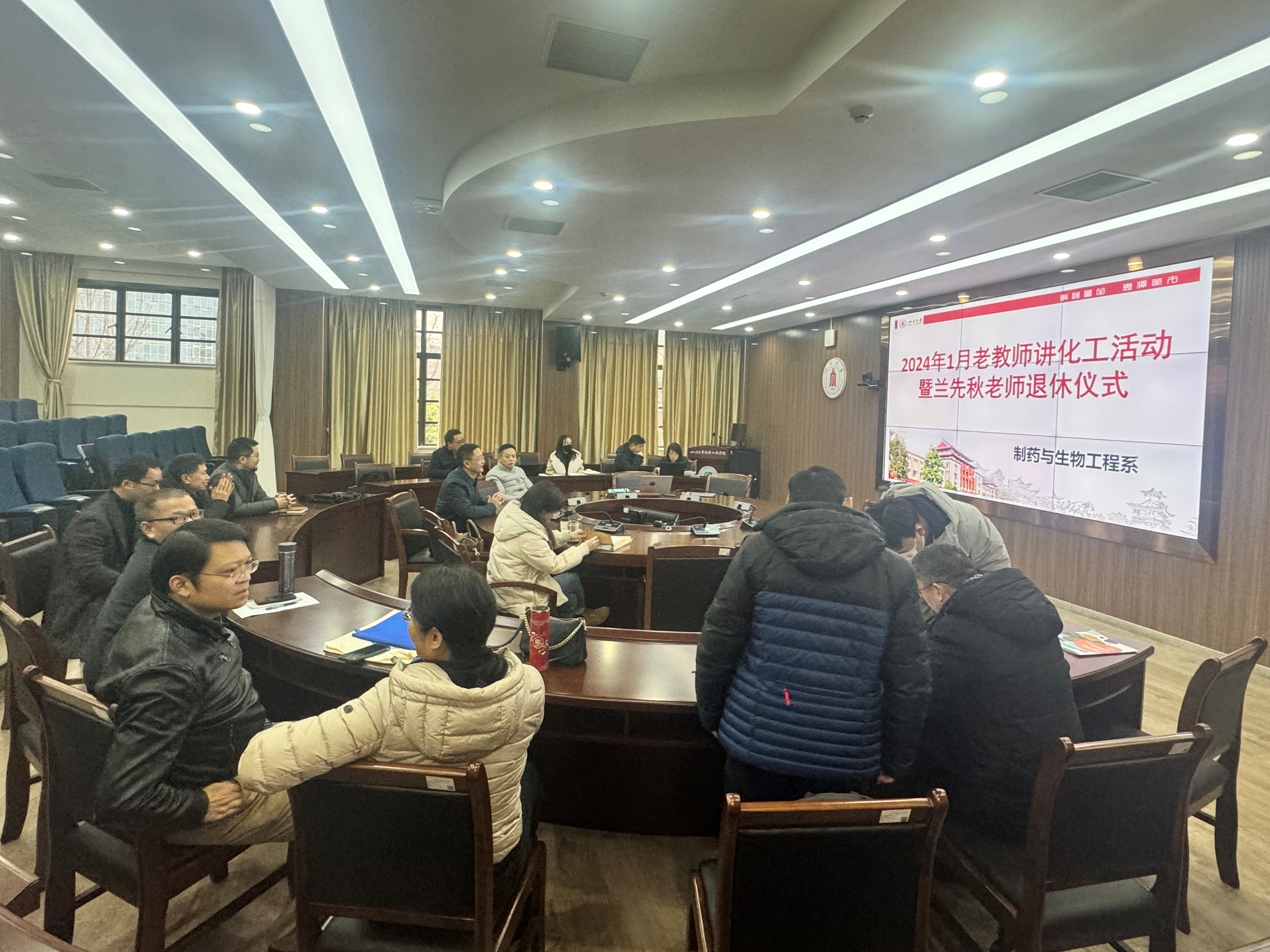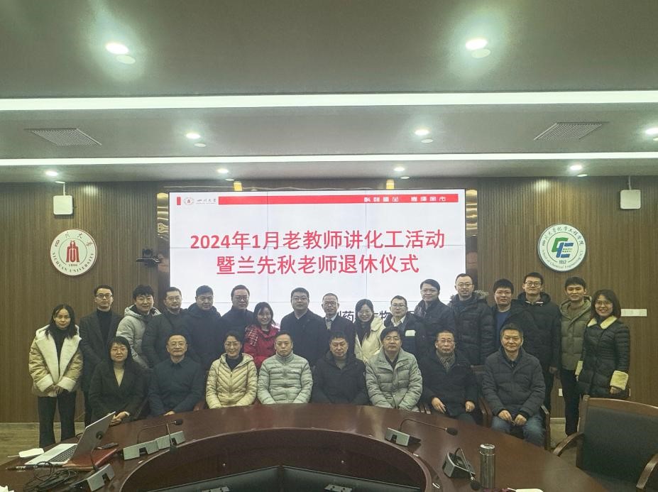 2024年1月5日上午,制药与生物工程系党支部和系工会小组在望江校区化工楼312会议室,联合开展了“老教师讲化工”活动暨兰先秋老师荣休仪式。系支部书记谢通慧主持活动。系退休教师何泽超老师、兰先秋老师,学院党委副书记兼纪委书记李德富,以及全系在职教师参加了此次活动。