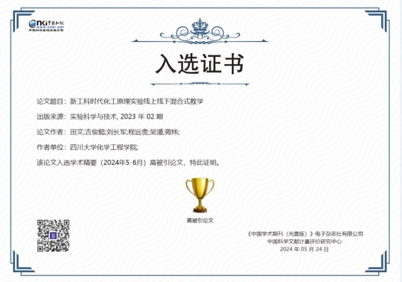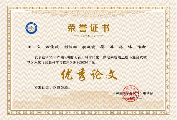 近日,从编辑部获悉,化工原理实验教研室2023年发表于《实验科学与技术》的实验教学论文《新工科时代化工原理实验线上线下混合式教学》入选该期刊2024年度优秀论文奖,学院教师田文为该论文第一作者,刘长军老师为通讯作者。该论文总结了化工原理实验教研室教师团队在新工科时代背景下对化学工程与工艺专业本科生化工原理实验教学的思考和实践,是实验教研室全体教师共同努力的成果。论文分析了当前化工原理实验教学的现状、课程难点和痛点问题,以及新工科时代对人才培养目标和培养模式的影响,结合川大化工学院化工原理实验教学改革,开展了线上线下混合式教学实践。