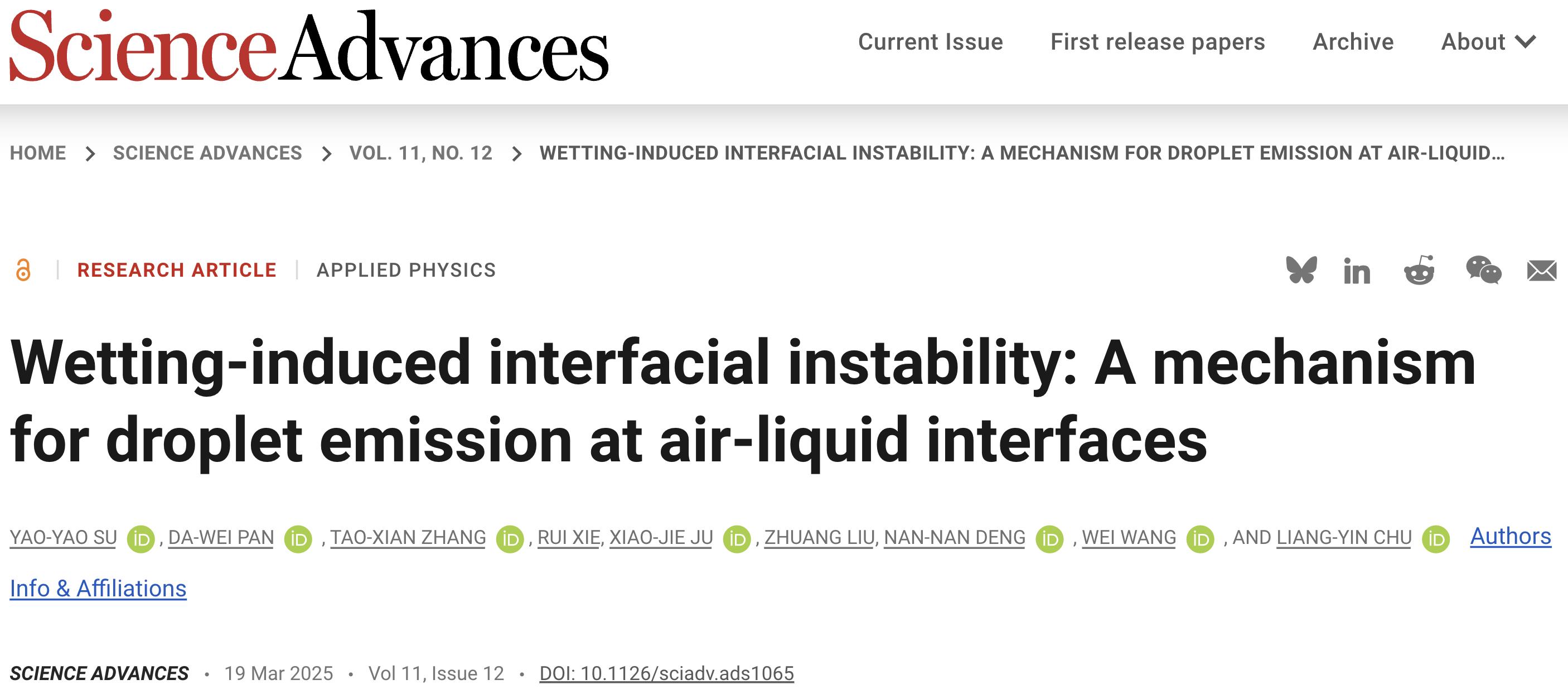近日,学院褚良银教授、汪伟教授团队与合作者在液滴微流控领域取得新进展,相关成果“Wetting-induced interfacial instability: A mechanism for droplet emission at air-liquid interfaces”发表于《Science Advances》期刊。污污漫画