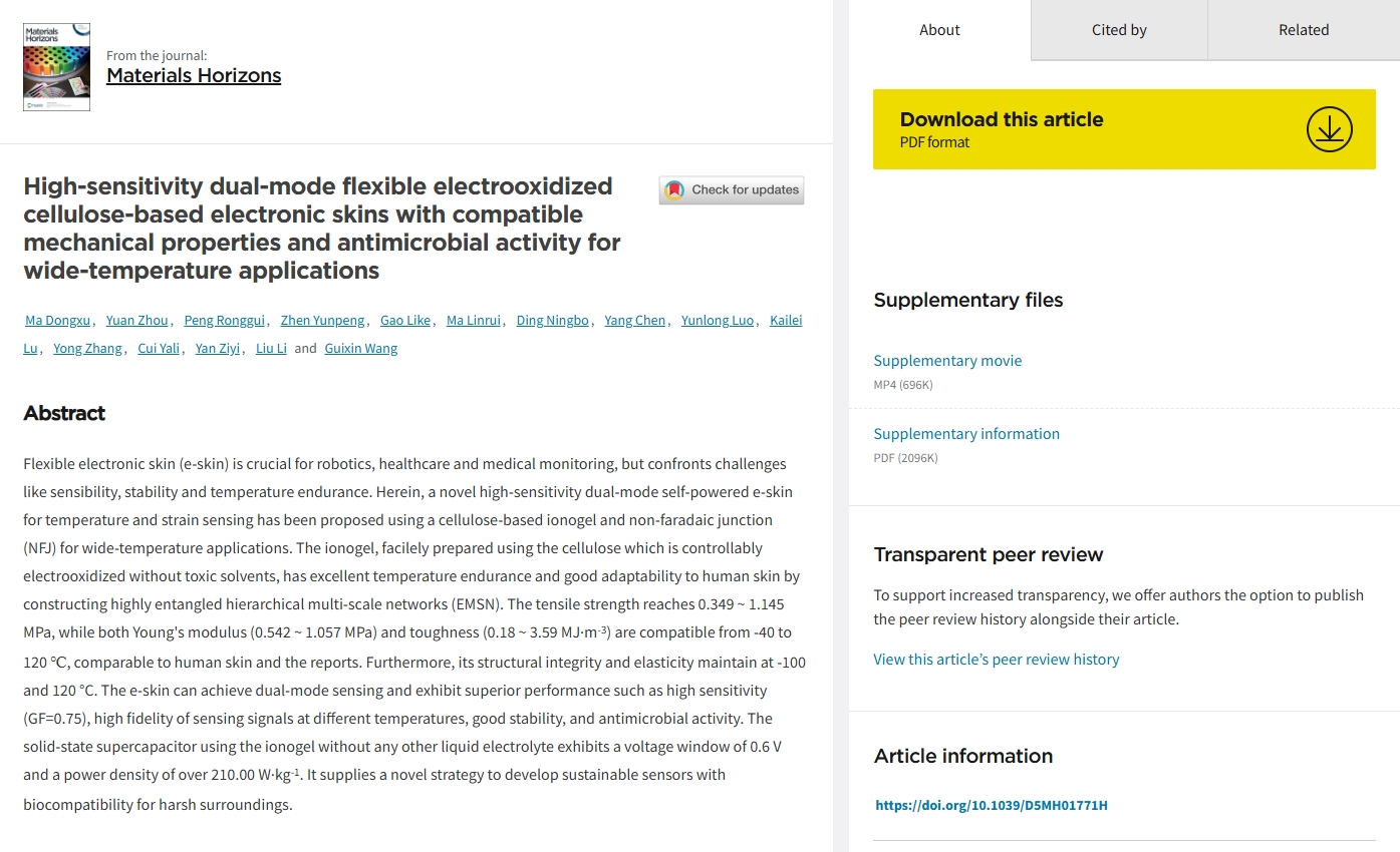 为了进一步提高固态电解质的柔韧性和温度使用范围,研究团队构筑了高度交织层级多尺度网状结构离子凝胶,在-100~120ºC有好的结构完整性和力学性能,将其与碳布组装成全固态超级电容器,在无添加任何液态电解液和无外界压力的情况下功率密度达到210.00 W·kg−1,经过5000次充放电循环后仍保持好的电极/电解质界面和电解质结构完整性。而且,该凝胶固态电解质也表现出好的应变与温度传感性能及抗菌性,为下一代快充电源和可穿戴自供电电子设备的开发提供了新策略。相关研究成果发表在《Materials Horizons》(//doi.org/10.1039/D5MH01771H)上,该论文第一作者为污污漫画