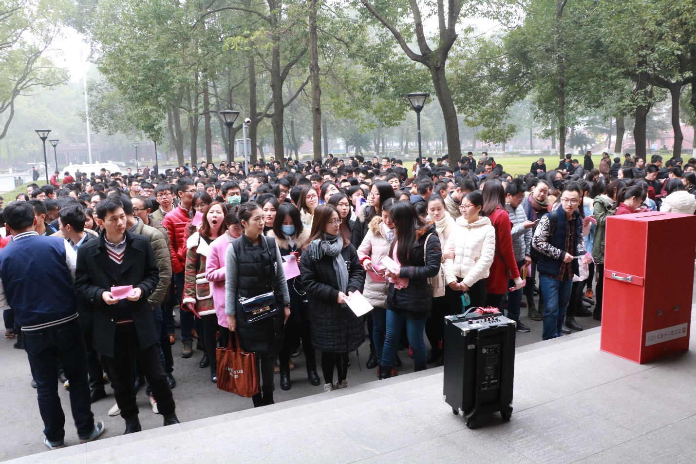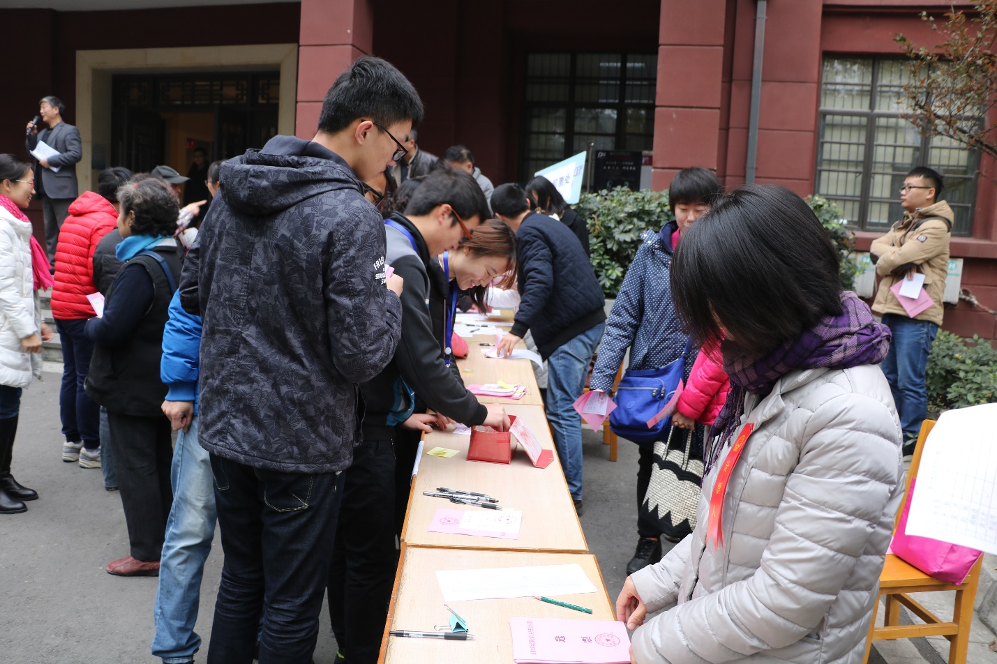 上午9:30,全体选民准时在望江校区化工学院正门口集合,全体师生按照系别、年级等各自在负责人处签到、领取选民证、选票。