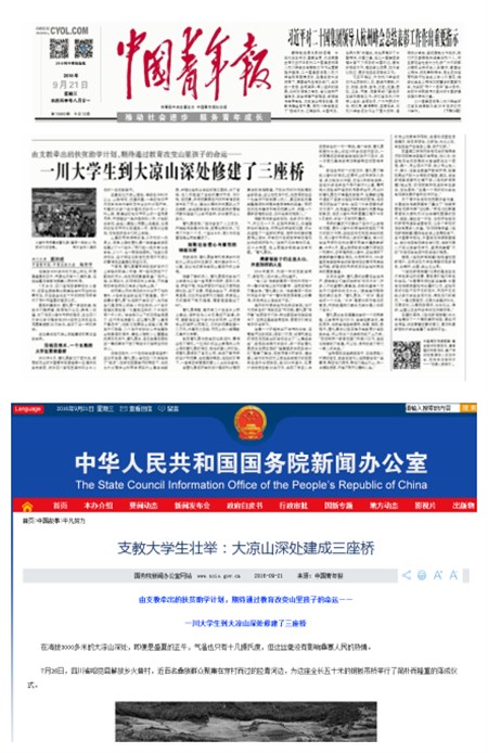 教育扶贫学生支教团优秀代表曹礼勇同学的感人事迹。旋即引发强烈反响,人民网、凤凰网、中国新闻网等众多主流权威媒体相继转载。据悉,此前《中国青年报》也曾以《一川大学生到大凉山深处修建了三座桥》报道支教团事迹,国务院新闻办官方网站还特别以“支教大学生壮举”为题对该报道全文转载。