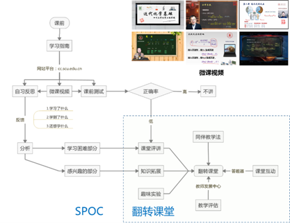 SPOC学习阶段:课前学生根据学习指南,在学校网站观看微课视频(4-5段约35分钟),在学校网站上做课前测试题(5-10道),并填写自习反思。在课前完成大部分传统课堂内容的学习。由电教中心的老师提供技术支持在学校课程网站统计学生学习情况并反馈给教师。