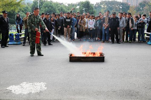 随后,来自双流消防中队的代指导为全体师生现场讲解消防安全知识、初期火灾的扑救和水带使用等。为了达到此次活动的目的,帮助师生了解最基本的消防工具的使用方法,全体师生两人一组亲身体验了灭火器的使用方法,代指导和胡毅老师还在一边现场指导,让大家更直观的了解灭火的基本知识和方法。