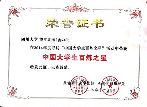 日前,化工学院2014级研究生赵磊、李星、余睿、邹达所在的望江校区北园2舍740被评为“中国大学生百炼之星” 寝室。