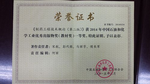 由宋航老师担任主编、马丽芳老师担任副主编,制药工程专业部分教师参与编写的教材《制药工程技术概论(第二版)》(化学工业出版社)荣获2014年度中国石油和化学工业联合会优秀出版物奖(教材奖)一等奖。