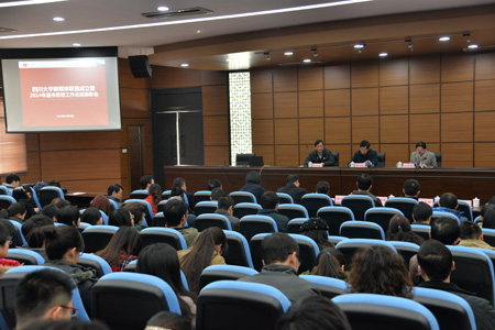 在望江校区明德楼414报告厅举行新媒体联盟成立仪式暨2014年宣传思想工作总结表彰大会。校党委书记杨泉明教授,校党委副书记周学东教授、李向成教授出席成立仪式暨总结表彰大会。学校相关单位参加了仪式暨大会。校党委副书记周学东教授主持成立仪式暨总结表彰大会。