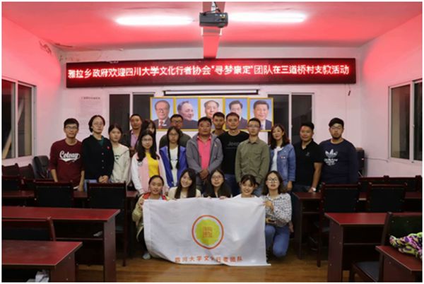 学生担任队长,文新、建环、公管、经济、公卫、临床和吴玉章学院的13名川大学生以及西财和川影的两位同学组成的SCU文化行者协会组织“寻梦康定”团队,于7月26日至8月16日在甘孜州康定市雅拉乡三道桥村开展了关于藏族儿童教育和康定传统文化习俗的暑期三下乡社会实践活动。此次社会实践的聚焦问题有三:一是对康定地区传统习俗的科学性探究,二是少数民族对于自身传统文化保护不足,三是少数民族对于儿童教育问题的重视程度不足。针对这些问题,团队队员们兵分四路,对藏戏、藏传佛教、藏族传统民居等进行一系列的考察,同时,队员们对当地参与的74名中小学生进行了语文、数学、英语、音乐、趣味手工、拔河、卫生知识科普等教学活动,并利用前期募捐图书建立了“梦想图书角”,引导他们培养阅读和自我管理的能力。通过这次实践活动,同学们不仅锻炼了自己的能力,还在一定程度上为增强藏族地区文化自信和非遗文化保护力度、提高少数民族儿童教育问题重视程度以及推动少数民族传统习俗的继承与保护上贡献出了自己的力量。