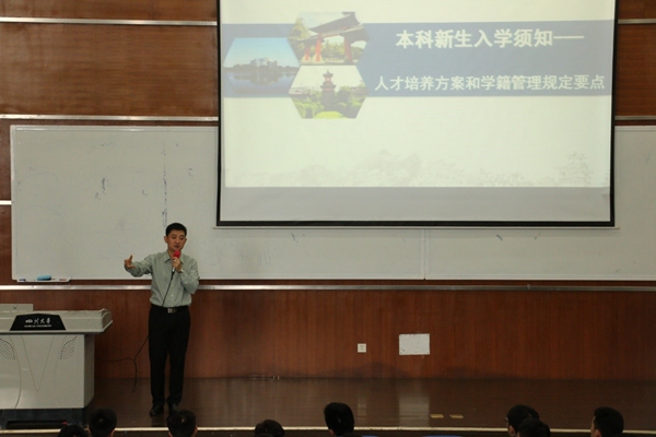 余徽副院长详细地介绍了本科生人才培养方案和学籍管理规定要点。他指出,新生们应该“严格学业管理,提高学业挑战度”,贯彻落实新时代全国高等学校教育工作会议精神,刻苦学习,助力国家,实现教育报国、教育强国梦。