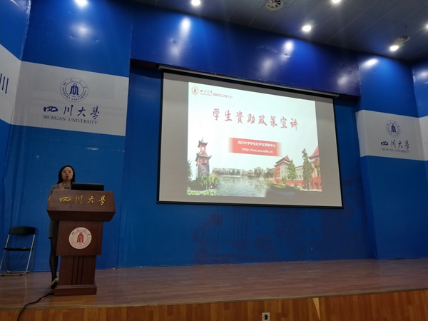 邀请学工部学生资助中心刘程老师为2018级新生做资助政策宣讲。活动在江安第一教学楼水上报告厅进行,2018级全体本科生以及新生辅导员参加活动。