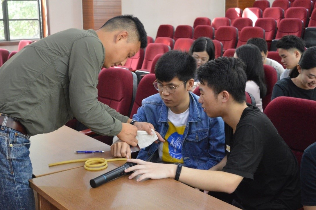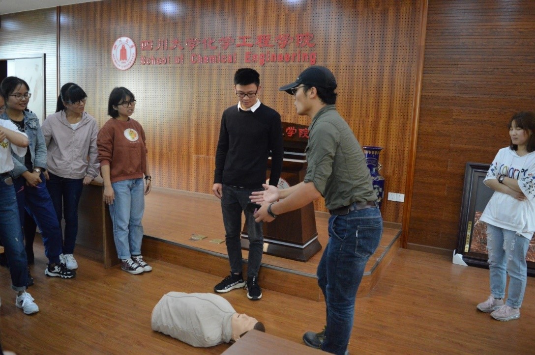 上午9点,在正行楼313报告厅,褚良银老师首先讲话,特别强调了此次实验室安全培训会的重要性。接下来,专业急救员黎教练给同学们讲解了烧伤、割伤等不同伤口的处理方式,以及身体不同部位受到伤害出血时的止血包扎技巧。同学们在教练的指导下,认真学习并进行现场实操。随后,教练给大家讲解了心肺复苏的具体操作办法,在场同学都踊跃参与训练,并掌握了基本的急救方法。