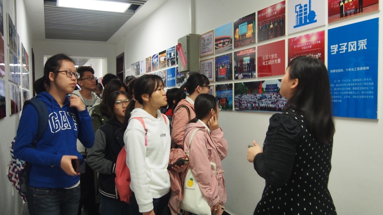 的发展沿革和教学科研成果,在接受历史文化的熏陶同时,更加叹服化工前辈们的成就和化工学科的魅力。通过参观化工楼文化走廊和博导照片墙,同学们直观地对化工学院师资力量、专业特色、人才培养、创新创业、国际交流、教学与科研成果等方方面面有了更深入的认识。在膜科学与功能材料研究室,讲解员向新同学们详细地介绍了实验室的基础设施、仪器设备、研究方向和实验室文化,让同学们对化工有了新的认识,了解了化工知识可以广泛应用于生物、医药、环境监测等诸多领域。