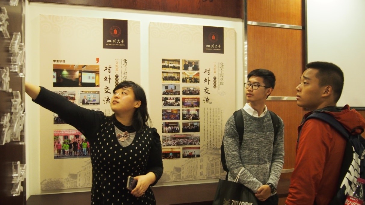 望江校区化工楼参观学习。本次参观活动是由新生研讨课和化工概论课任课老师褚良银教授、穆畅道教授、谢锐教授和汪伟副教授发起,由谢锐教授和汪伟副教授组织、来自膜科学与功能材料研究室的“金牌讲解员”刘露月博士、师璐硕士、尹微虹硕士进行引导和解说,赵晓萌硕士和李新娇硕士负责签到和拍照。