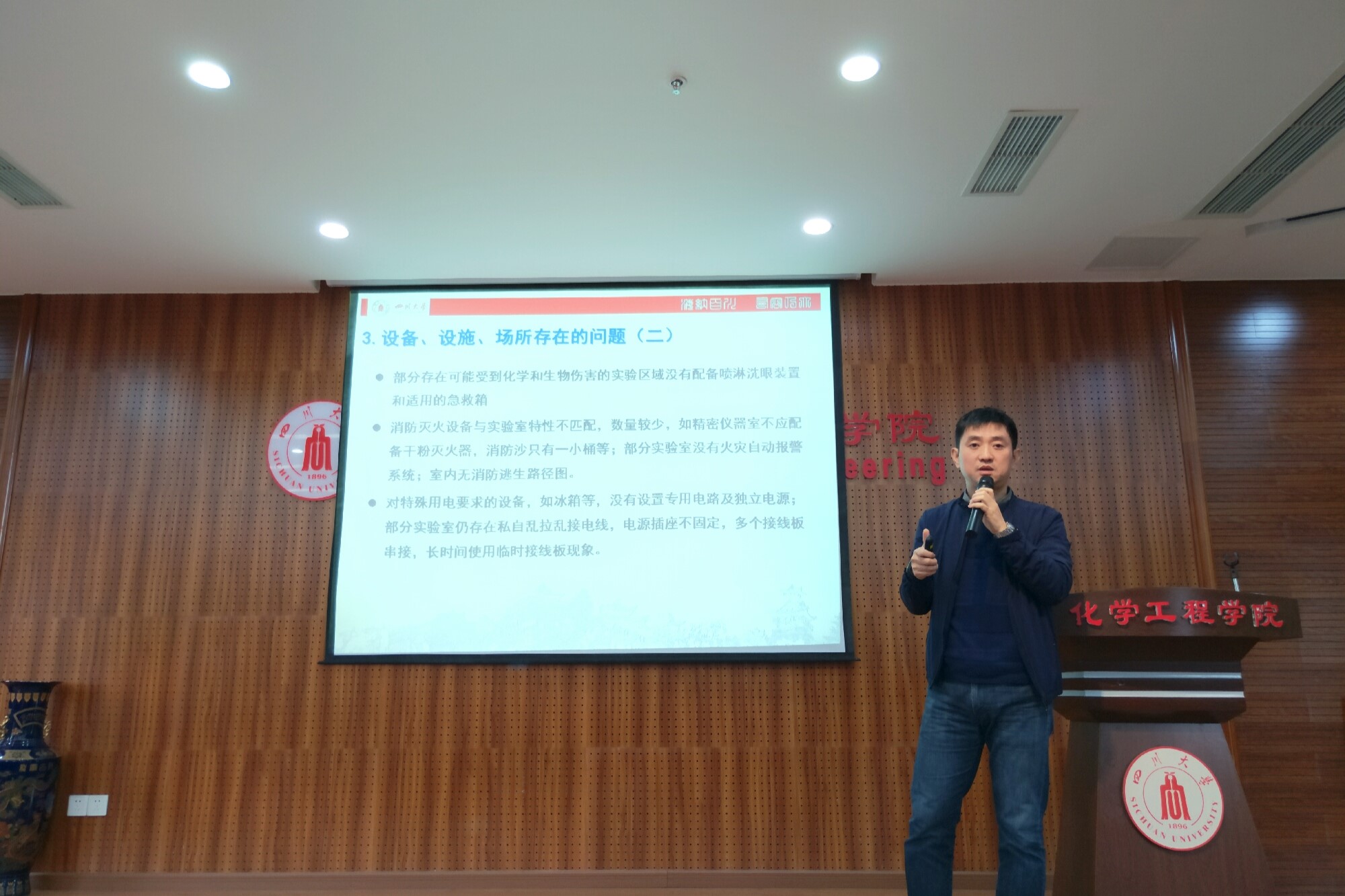 讲座伊始,余徽副院长就教育部科技司以及学校对实验室安全的总体要求和重点、安全隐患排查时间安排、检查依据等进行了讲解。他具体指出了实验室现存的以下五个问题:安全管理措施不够完善、化学品安全设施设备不够规范、部分设施设备及其放置场所不够合理、工艺过程缺乏监督以及实验室平面分布的部分缺陷。他通过学校各实验室真实的图片以及鲜明真实的危险案例,巧妙结合幽默风趣的语言,向大家展示了部分实验室存在的严重安全隐患,让同学们在欢乐的同时也对此做出深刻的反省。接下来余徽副院长就学院对实验室安全的现状、要求以及管理办法进行了详细讲解,重点强调了实验室主要存在的安全隐患点,最后要求每一位实验室成员通过学院网络数据服务中心完成在线安全考试。