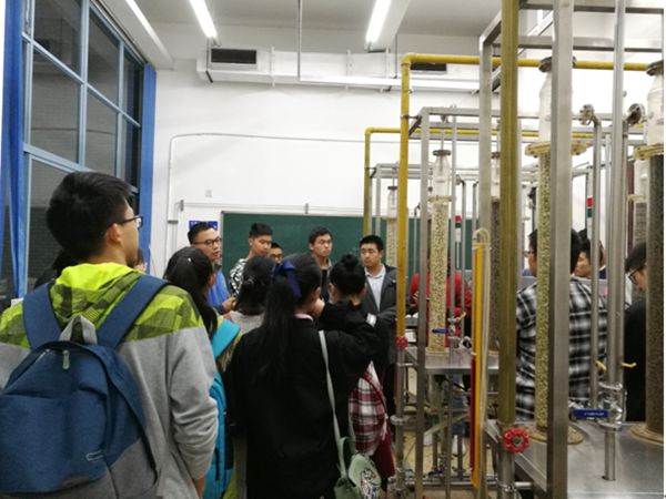 吴潘、田文、左炀和程远贵等老师带领同学们参观了化工原理实验室,向同学们介绍了吸收、精馏、传热及流体等各种化工原理实验装置的设计原理及用途,并结合实际应用举例,提出一些生活中与化工密切相关的问题与大家探讨,激发同学们对化工的兴趣。