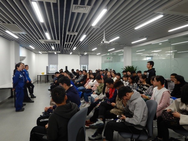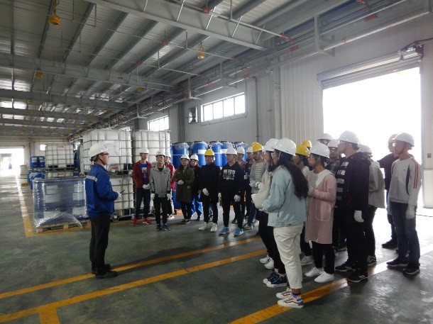 同学们到达陶氏化学四川工厂后,陶氏化学北亚区改进经理李东升和陶氏化学四川工厂安全经理汪涛首先给同学们进行了安全培训,同时为介绍了陶氏化学整体情况、EHS理念和管理规范,让同学们了解到现代化工企业从设计、建设到运营始终以环保、健康和安全为前提的。随后同学们分两组,带上了安全帽、护目镜、手套等个人防护装备,分别在李东升和汪涛两位经理的带领下对陶氏化学四川工厂的生产线和实验室进行了参观。两位经理为同学们细致地介绍了从聚合物单体原料到最终的产品检验、包装、物流的整个生产工艺流程,以及废水处理系统。所到之处各岗位负责人都热情地为同学们介绍了各岗位的作用,职责和安全生产规范,让同学们充分感受到了化工人的骄傲和自豪。