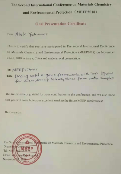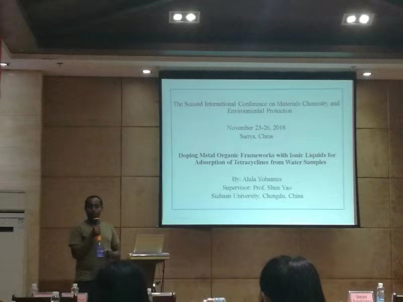 制药工程专业三年级博士研究生Nigussie Alula Yohannes(埃塞俄比亚籍)出席该会议并于大会上作题为“Doping Metal Organic Frameworks With Ionic Liquids For Adsorption Of Tetracyclines From Water Samples”的研究报告。本次会议吸引了众多来自材料化学、分离科学、化学工程及环境工程等不同研究领域的研究员、科学家、工程师和学者,是污污漫画