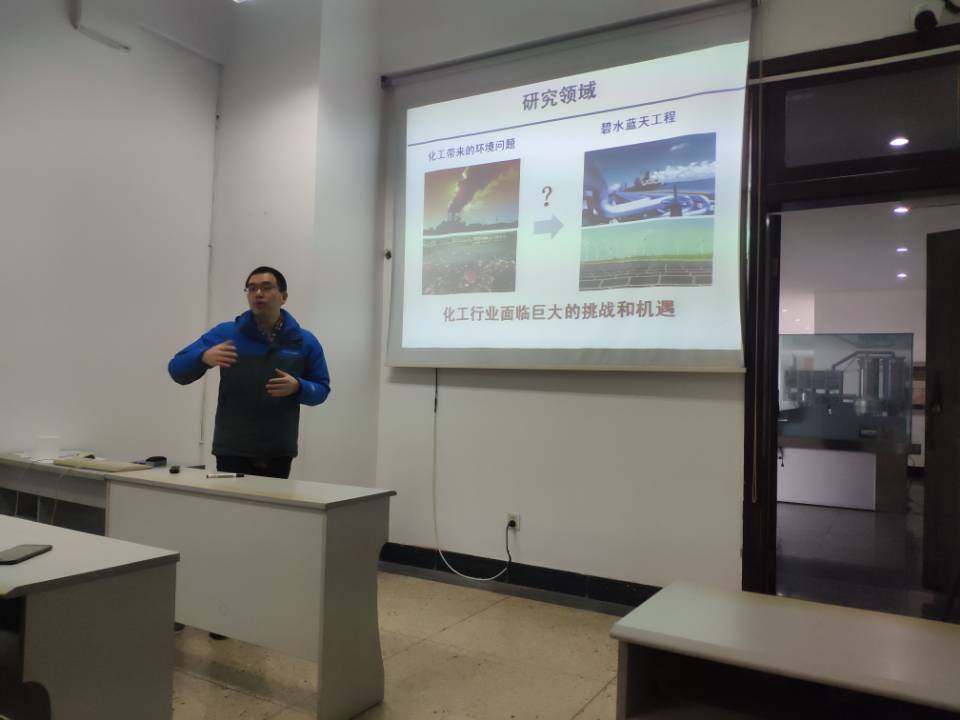 进入实验室之前,刘长军副教授首先向同学们介绍了低碳技术与化学反应工程研究室的概况,介绍内容主要围绕“团队介绍”、“研究领域”、“研究方向”、“研究成果”、“研究平台”几个方面进行,使得同学们对研究室也有了初步的了解。研究室以梁斌教授牵头,由6位教授,4位副教授,3位讲师,4位博士后和60余位硕士、博士研究生组成。刘长军副教授向学生们仔细讲解了研究室以资源与能源高效利用新技术和低碳与废物处理技术的开发为主的研究领域,以及主要分为六个方面的研究方向,分别是催化与反应工程、新型功能材料、环境化工、化工过程强化、矿物加工及冶金、生物基化学品及能源。如今,研究室已经取得了许多研究成果,如钛资源利用新工艺技术、醋酸乙烯精馏塔工艺优化、磷化工新技术开发等等,同时与其他海内外研究团队也建立了合作关系。
