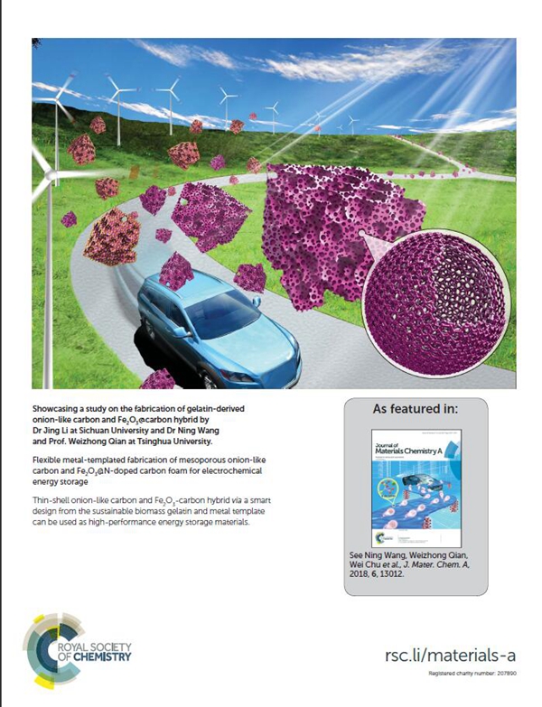 另外,课题组前期在超级电容器领域也取得了一系列进展。采用金属模板法获得多功能的高性能储能材料,相关成果Flexible metal-templated fabrication of mesoporous onion-like carbon and Fe2O3@N doped carbon foam for electrochemical energy storage(封底论文)”发表在《Journal of Material Chemistry A》(IF=9.931)。原文链接: