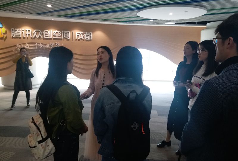 师生应成都腾讯众创空间邀请,举办了走进“腾讯众创空间”活动。由李颖丽老师带队,在众创空间接待负责人陈萧萧和分享负责人刘珂名的带领下依次参观位于成都高新区天府三街腾讯大厦B座的腾讯众创空间,运营商成都天象互动众创科技服务有限公司。