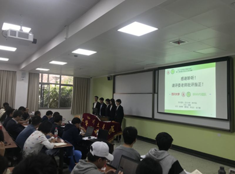 上午9时,决赛答辩在江安一教B103进行,参赛小组以答辩的形式进行比赛,答辩环节分为15分钟作品介绍时间和15分钟评委点评提问时间,每支队伍选手们着正装上台介绍提交的作品,分析工艺流程、介绍厂图、进行经济分析和分析创新性等,流利具体地结合答辩ppt介绍本组作品,然后由本校以及外校评委点评提问,提出作品存在问题,并给予改进意见,最后由评委和往届获奖队伍打分,同时参赛队伍互评,分出名次。