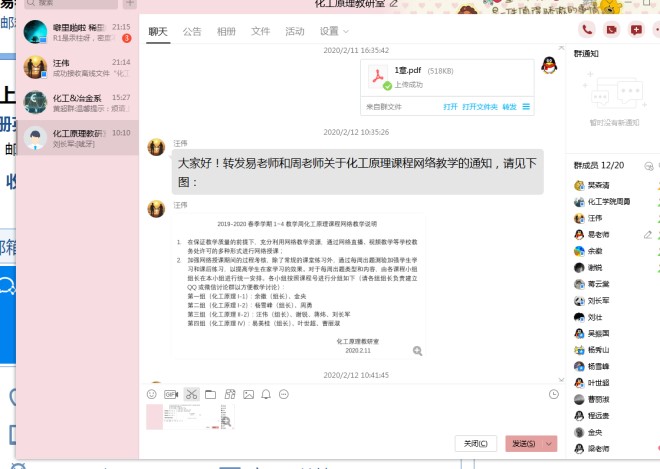化工原理教研室老师分别通过QQ群进行了网络教研活动。