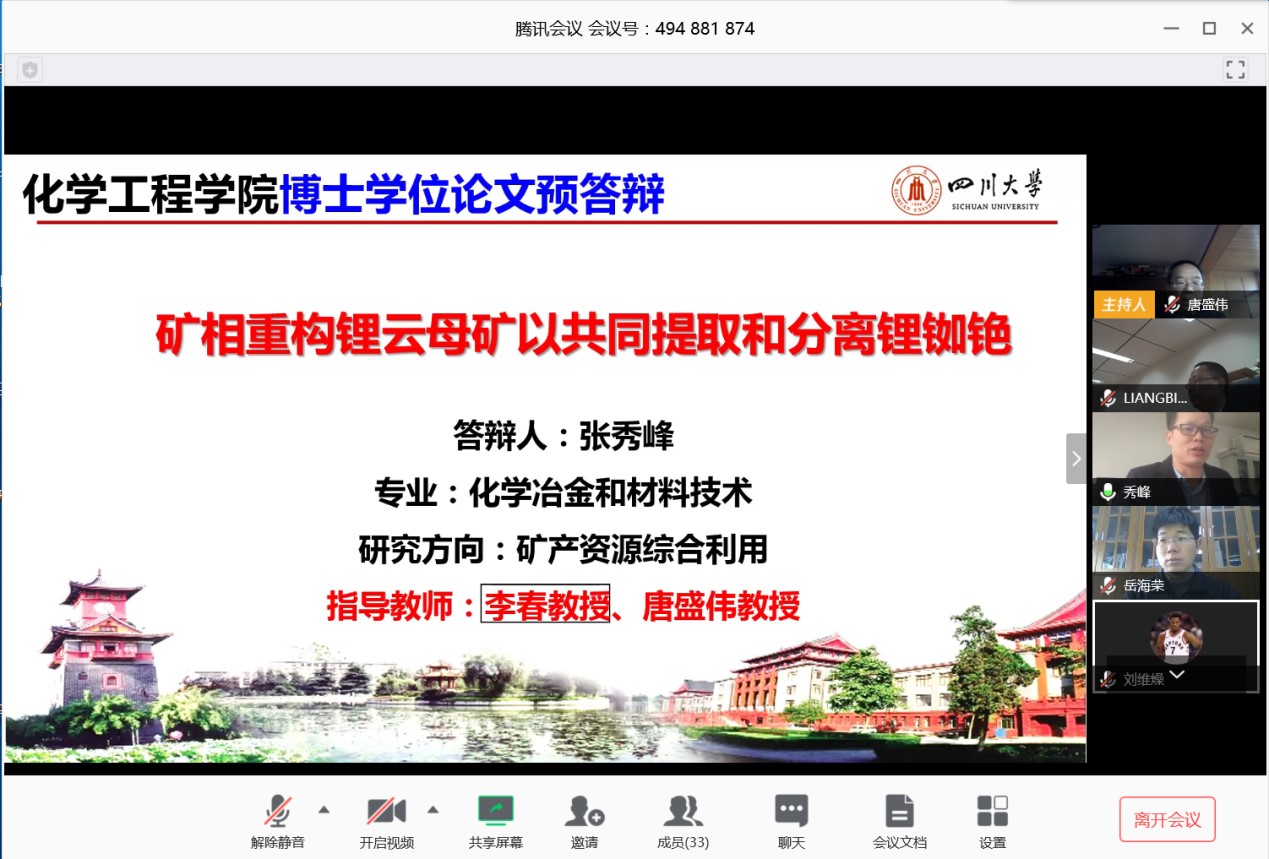 2015级化学冶金与材料专业博士生张秀峰,指导教师:李春教授,唐盛伟教授。本次预答辩委员会由梁斌(组长)、张永奎、岳海荣、唐盛伟四位教授组成;答辩秘书:罗冬梅副教授。参加本次线上答辩会师生41人,研究生教务老师李根全程参加答辩会。