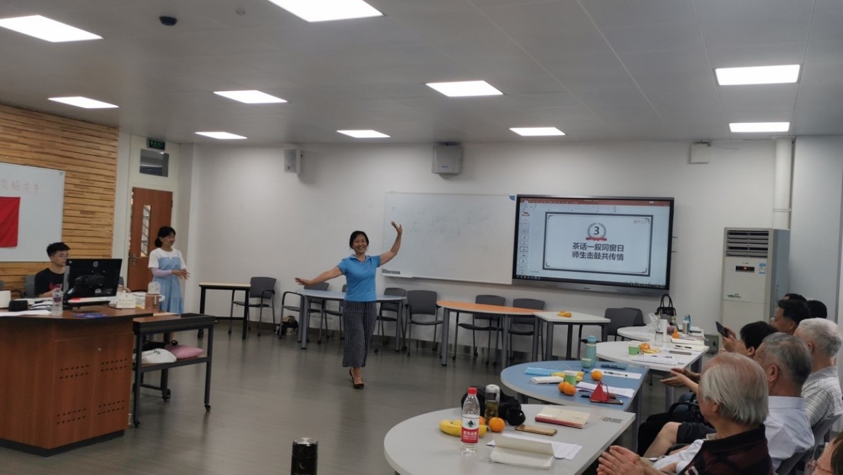 茶话会活动现场还进行了老少皆宜的游戏——击鼓传花。伴着师生们的欢声笑语,大家纷纷走上舞台表演精彩的舞蹈、诗朗诵、唱歌等节目。所谓“鼓不打不响,花不传不香”, “击鼓传花”传的是一种精神,一种团结一致、激流向上的精神;传的是一种爱心,一种无私奉献、全心全意的爱心。